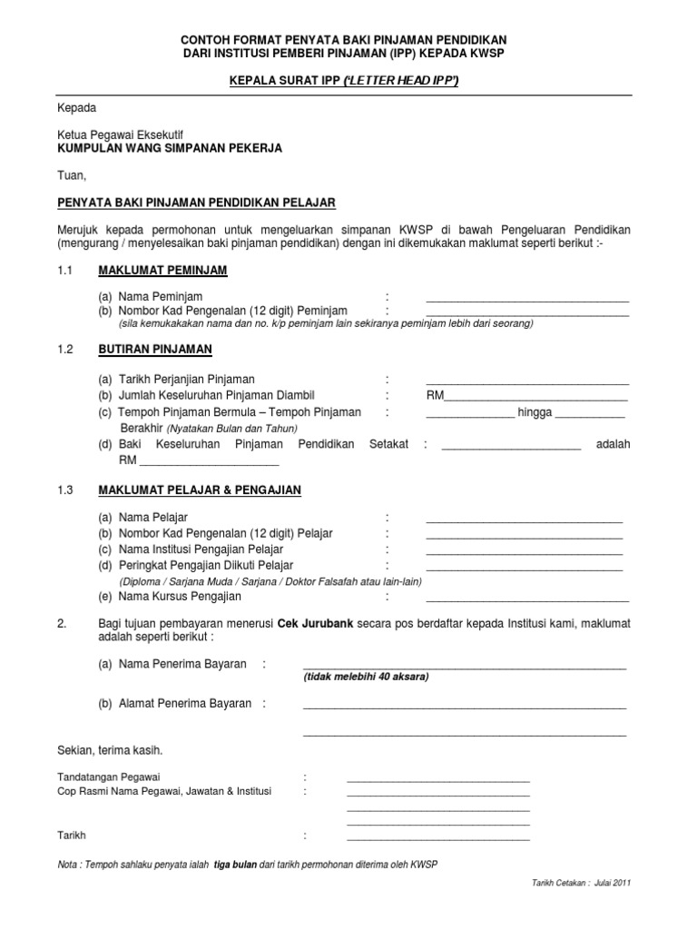 Contoh Format Penyata Baki Pinjaman Pendidikan
