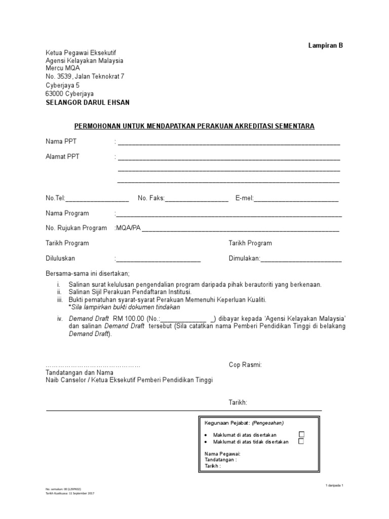 Lampiran B Permohonan Untuk Mendapatkan Perakuan Akreditasi