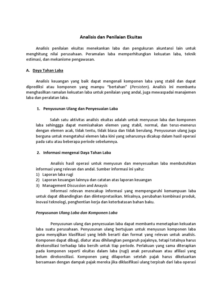 Salah satu aktivitas analisis ekuitas adalah untuk menyusun laba dan komponen laba sehinggga dapat memisahakan elemen yang stabil normal dan terus menerus dengan elemen acak tidak tentu tidak biasa dan tidak berulang. Laba ditahan atau saldo laba retained earnings modal disetor modal yang ditanamkan oleh para pemegang saham ke perusahaan.
