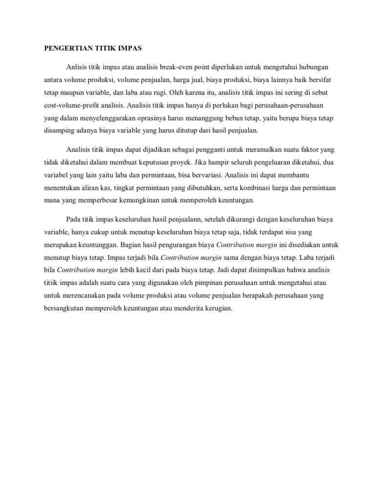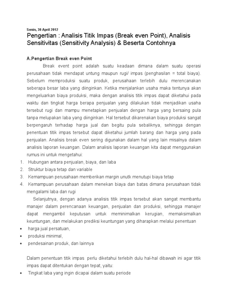 Pengertian Analisis Titik Impas Break Even Point Analisis