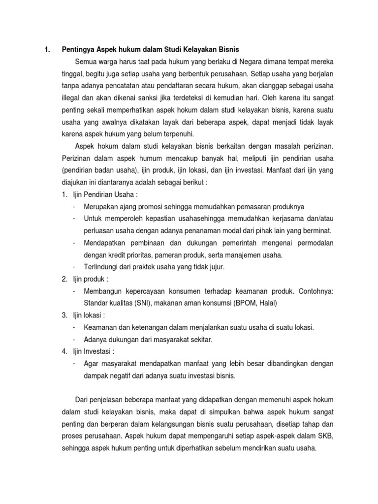 Tujuan analisis aspek hukum dalam studi kelayakan bisnis. Studi kelayakan bisnis pengertian manfaat aspek materi tahapan contoh. Aspek pasar adalah inti dari penyusunan studi kelayakan proyek karena permintan pasar terhadap produk merupakan dasar untuk menyediakan produk. Studi kelayakan bisnis adalah kegiatan dalam menganalisa unsur dan elemen elemen penting dalam dunia bisnis baik dari unsur ekonomi hukum sosial budaya pemasaran hingga unsur manajemen seperti keuangan produksi sumber daya manusia strategi dan lain lain yang bertujuan untuk mengambil keputusan keputusan penting. Tujuan dari aspek hukum adalah untuk menilai keabsahan kesempurnaan dan keaslian dari dokumen yang dimiliki.